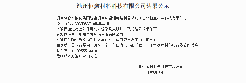 喜報 + 1!感謝 [池州恒鑫] 的再次選擇,我司成功中標 池州恒鑫材料科技有限公司[石灰乳及藥劑制備系統采購項目]和[稱重螺旋給料器采購項目]!基于過往的成功合作,這次我們更懂需求、更有底氣,定不負期待!
